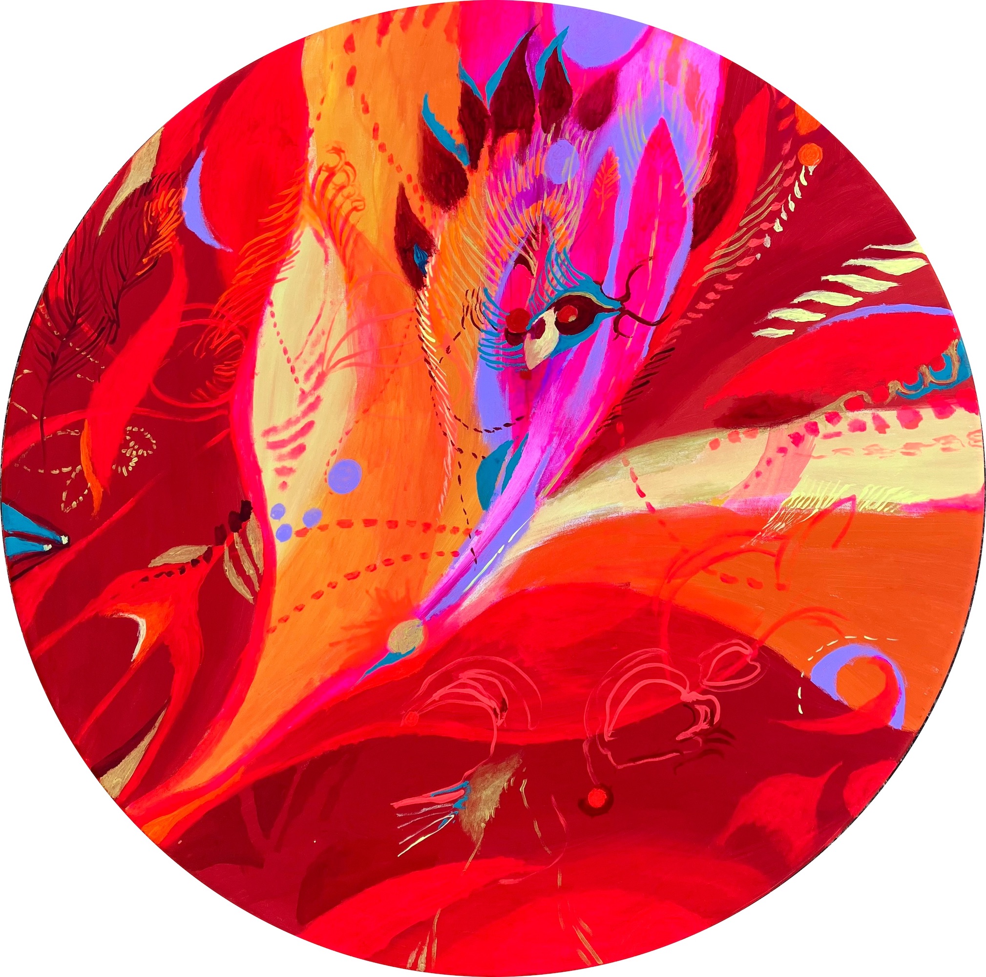 Vi aspettano tele in cromie accese ed acquerelli delicati, quasi astratti, che visualizzano l’invisibile, la connessione tra il mondo tangibile e le sfere spirituali: